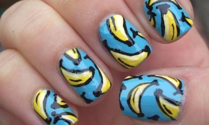 С чем сочетать рисунок Бананы на ногтях могут располагаться как по одному, так и по несколько штук. А если не хочется сильно перегружать рисунок, можно